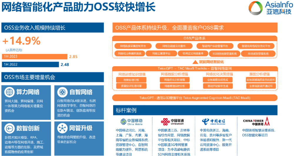 上半年,运营商在算力网络、自智网络和传统网管的升级换代给304am永利集团带来更多机会,这也使三新业务当中OSS收入达人民币2.85亿元,同比上升14.9%,占总体收入比重8.7%。